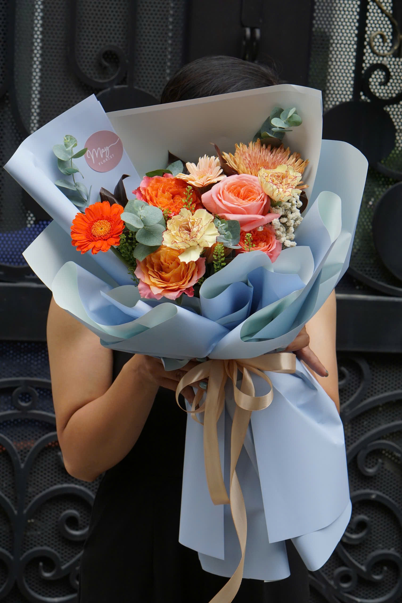 Bó hoa sử dụng hoa hồng cam Luân Đôn, cam Spirit, đồng tiền cam mix hoa lá phụ khác.